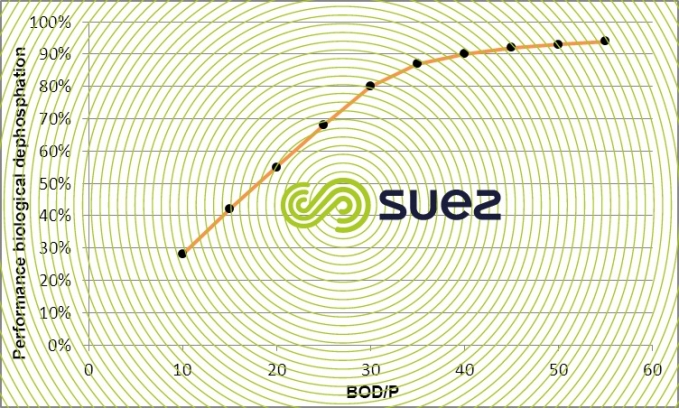 With an influent that has a low phosphorus content and a favourable BOD/P ratio (upper than 30), we can achieve a discharge that contains less than 1 mg · L–1 of total phosphorus. However, in the case of typical domestic water, this order of magnitude cannot be guaranteed without supplementary chemical precipitation.