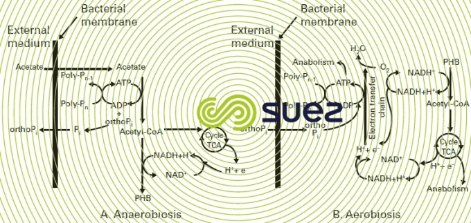 - using energy available from polyphosphates (previously stored: see aerobic phase), the PAO assimilate acetate and glycogen contained in their cells and synthesise intracellular storage products, PHAs (Polyhydroxyalcanoate), the most important of which is PHB (Polyhydroxy butyrate).Simultaneously with the absorption of acetate, orthophosphate (ortho-P) will be released together with magnesium, potassium and calcium cations;