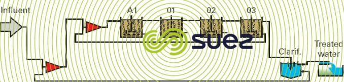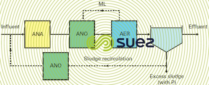 A variation of this process has been implemented at the Valenton facility. It consists in introducing a raw water fraction in endogenous denitrification (a maximum of 30%), which permits sludge recycling denitrification to be permanently managed and a nitrate-free liquor to be introduced during anaerobia.