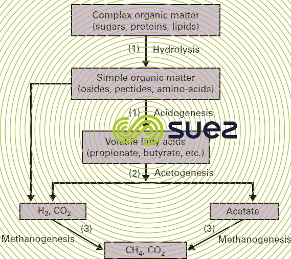 This initial phase produces a mixture of volatile fatty acids (VFA): acetic, lactic, propionic, butyric…, neutral compounds (ethanol), gas products (CO2 and H2) and ammonium.