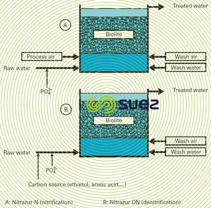 This type of treatment is used in a biofilter that has a special granular material such as biolite. A more detailed description of the relevant Nitrazur DN process (similar to the Biofior DN) developed by SUEZ can be found in the section removal of nitrates Figure 44 sums up the main design differences between a Nitrazur N (see nitrogen conversion) and a Nitrazur DN filter.