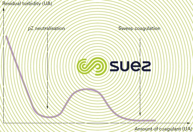 "Ideal" coagulation occurs at pZ = 0, ensuring optimum elimination of all particles (clay turbidity, micro algae…); in drinking water treatment, the thorough elimination of dissolved OM may require a higher level of treatment. An amount of coagulant that is progressively higher than that which will cancel out the pZ will initially cause residual turbidity to appear (figure 4, using arbitrary units = UA) by reversing charges (trivalent cations cause pZ to become positive) before removing this turbidity by capturing the colloids in the excess floc ("sweep coagulation"; this coagulation mode is sometimes applied while at the same time using H2SO4 to lower the pH ("enhanced coagulation", applied in particular to ensure thorough elimination of the organic precursors of oxidation by-products).