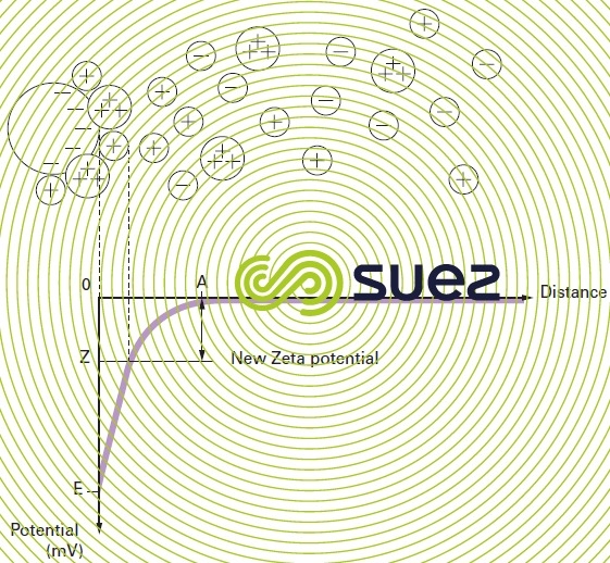 Therefore, coagulation is the destabilisation of colloidal particles though addition of a chemical reagent, the coagulant, which provides the medium with multivalent cations that are either free or bonded to an organic macromolecule (cationic polyelectrolyte). These cations are adsorbed and attached in the first Stern layer; the pZ then rises (figure 3) until it reaches zero or a negligible figure as neutralisation of all the particle’s electronegative charges is achieved (figure 7, see section treatability tests).