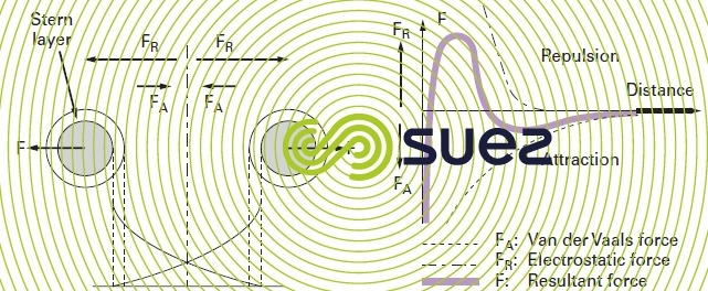 Therefore, in order to destabilise the suspension (coagulation), we need to decrease electrostatic repulsion forces and this involves neutralising colloid surface charges: this is what happens when we add a so called “coagulant” into the water (figure 3 and explanations in general comments).