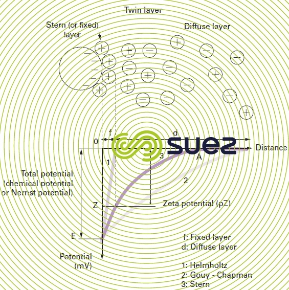 - the Stern theory that combines the two foregoing theories and entertains the formation of a twin layer: the first is formed of ions from the liquid and adheres to the colloid; the second layer diffuses through the liquid that directly surrounds the colloid. As illustrated in figure 1 (curve 3), the potential is subject to a major initial drop in the attached layer and then decreases slowly as the distance increases, until it cancels out at point A (isoelectric point).