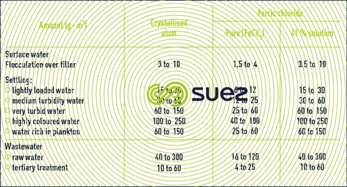 Table 6 provides a rough guide to the amounts of iron or aluminium salts, expressed in g · m–3 (or mg · L–1), to be used in clarification treatment.