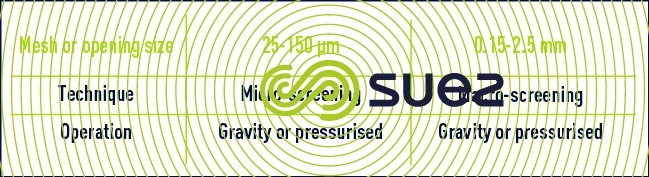 - either providing protection against relatively large (a few mm) blocked openings; washing sprayers, some once-through or open recirculating cooling circuits, with a 0.5 to 5 mm straining threshold. Upstream from hollow fibre UF membranes, a finer mesh (100-200 μm) will be required;