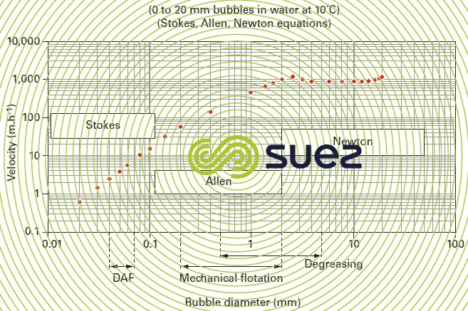 As the bubble diameter increases, its increasing rising velocity augments the flow turbulence around the bubble and Stokes law ceases to apply; therefore figure 31 makes successive use of the Stokes, Allen and Newton (see different types of sedimentation) equations to calculate the rising velocity of bubbles measuring between 20 and 20 000 μm.
