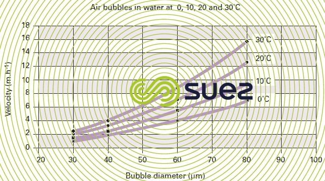 - 50 μm bubbles have a rising velocity of approximately 6 m · h–1 to 30 °C or 4 m · h–1 to 10 °C;