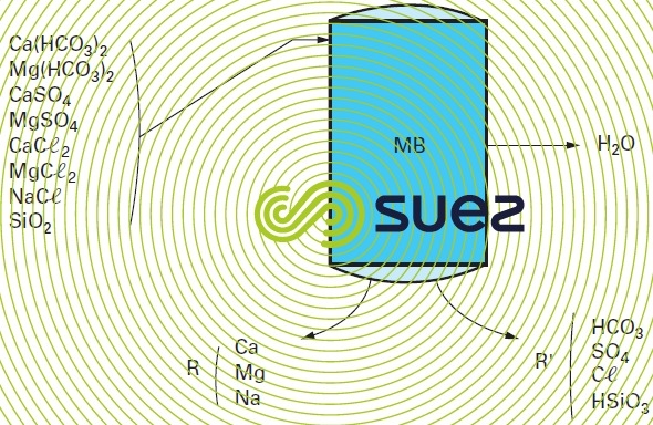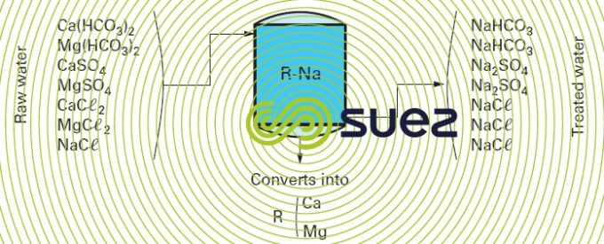 All alkaline earth metal salts (mainly TH) as well as metallic ions alcalino-terreux) in the treated water are converted into sodium salts. Treated water will have almost zero hardness. Its pH and alkalinity remain unchanged. Softening can be carried out after a preliminary purification using lime to eliminate bicarbonates and reduce M-alk. to a level that will usually range from 2 to 4°F. In this case, the water obtained will have had its carbonates removed and will be softened (figure 82).