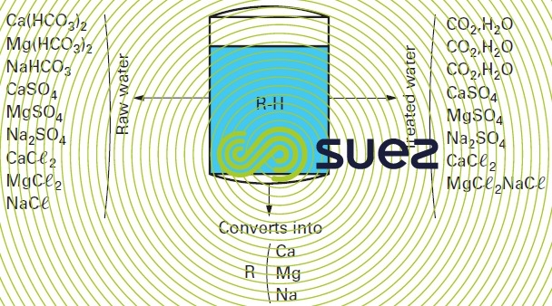 Therefore, hardness may be zero when TH is lower than or equal to M-alk. as a preferential exchange will have occurred between the alkaline-earth ions and the alkaline ions. Should the contrary occur, zero hardness can be obtained by combining, in the same unit, a layer of carboxylic resin and a layer of sulphonic resin, successively regenerated using a strong acid and a sodium chloride solution.
