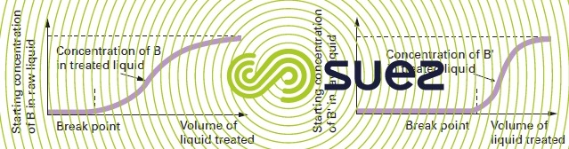 If we seek to pursue the treatment until we achieve major elimination of one ion to the detriment of the other, we will need to gradually shift the equilibrium by causing the liquid to percolate through a series of exchanger layers, each containing fewer ions to be fixed, in order to follow the equilibrium curve until it comes close to zero concentration for the unwanted ion.