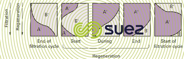 Regeneration takes place by percolating a concentrated A’ ion solution, either in the same direction as saturation (co-current regeneration) or in the opposite direction (countercurrent regeneration).