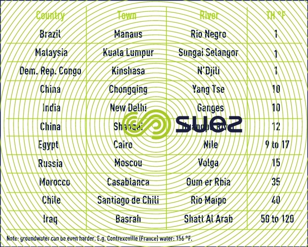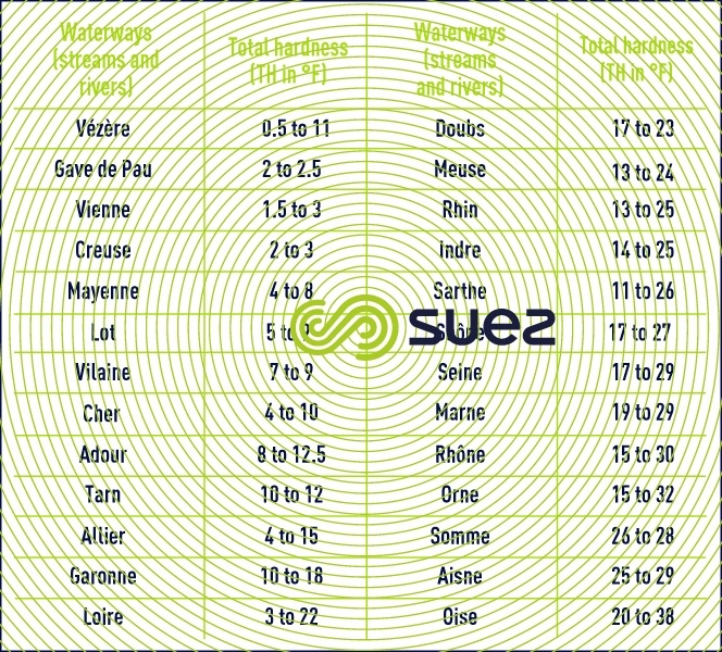 As a consequence of the above, water hardness, measured by its TH (in F°) will vary widely from one area to the next (tables 43 and 44).