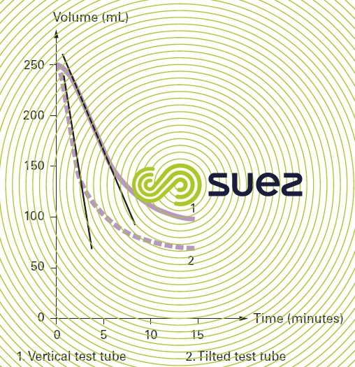 This phenomenon can easily be observed in the laboratory, by comparing the Kynch curves (see section different types of sedimentation) obtained for the same sludge in both a vertical test tube and one that is titled by approximately 60° to the horizontal (figure 29). This type of "sludge blanket" / lamellar clarification combination enables us to concentrate the sludge blanket and to reach velocities that are 2 to 3 times higher than in the traditional accelerated sludge blanket clarifiers. This is the principle that underlies Superpulsator and Ultrapulsator clarifiers (see technology chapter flocculators – settling tanks – flotation units).
