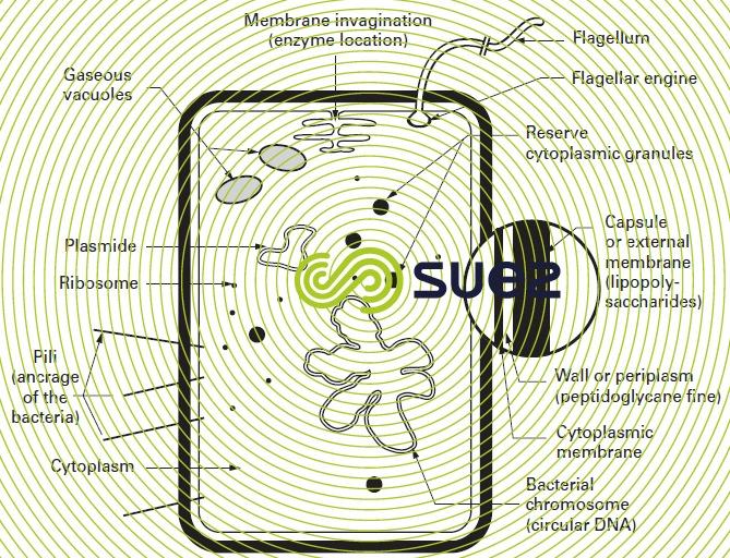 As is the case with all living cells, the bacterial cell (figure 9) contains deoxyribonucleic acid ( DNA), which constitutes the genetic information support: it is the main component in genes, with are aligned into filaments called chromosomes. However there is a key difference in relation to other living beings: