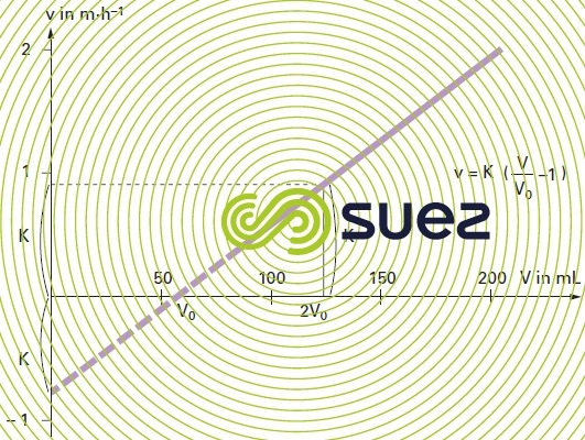 To calculate the velocity v, if A is the height of the test tube in millimetres for 100 mL (distance separating the 100 and 200 mL markings on a 250 mL test tube), v is equal to 3.6 A/t m.h-1