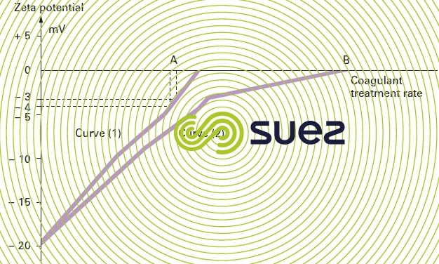The change in potential (expressed in millivolts) versus the amount of coagulant used can be plotted (see figure 7 below). For waters that match curve 1 (primarily colloidal turbidity), amount A of the reagent is required to achieve a – 3 to – 4 millivolt potential. On the other hand, for waters with a high content of algae or OM that match curve 2, amount B is required to cancel out the Zeta potential.