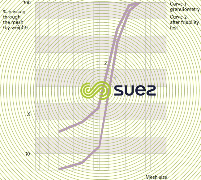 It is compulsory for friability measurements to be carried out on the same 50 mL sample of filter material in the form of three successive measurements. With the first measurement, the granulometry of the material tested is established. Then, all the material is collected from each screen and placed in a metal cylinder having a 40 mm internal diameter and a 100 mm useful depth. This cylinder is mounted radially on a 34 cm diameter wheel. 10 x 12 mm Ø steel balls are also placed in the cylinder. This wheel rotates at 25 rpm round a central shaft. After 15 minutes of operation (i.e. 375 revolutions and, therefore, 750 strokes), the material’s granulometry curve can be plotted. All the material is then collected again and put back into the metal cylinder with the 18 steel balls. After a further 15 minutes (or a total of 750 revolutions and, therefore, 1 500 strokes), a new granulometry curve is plotted for the material.